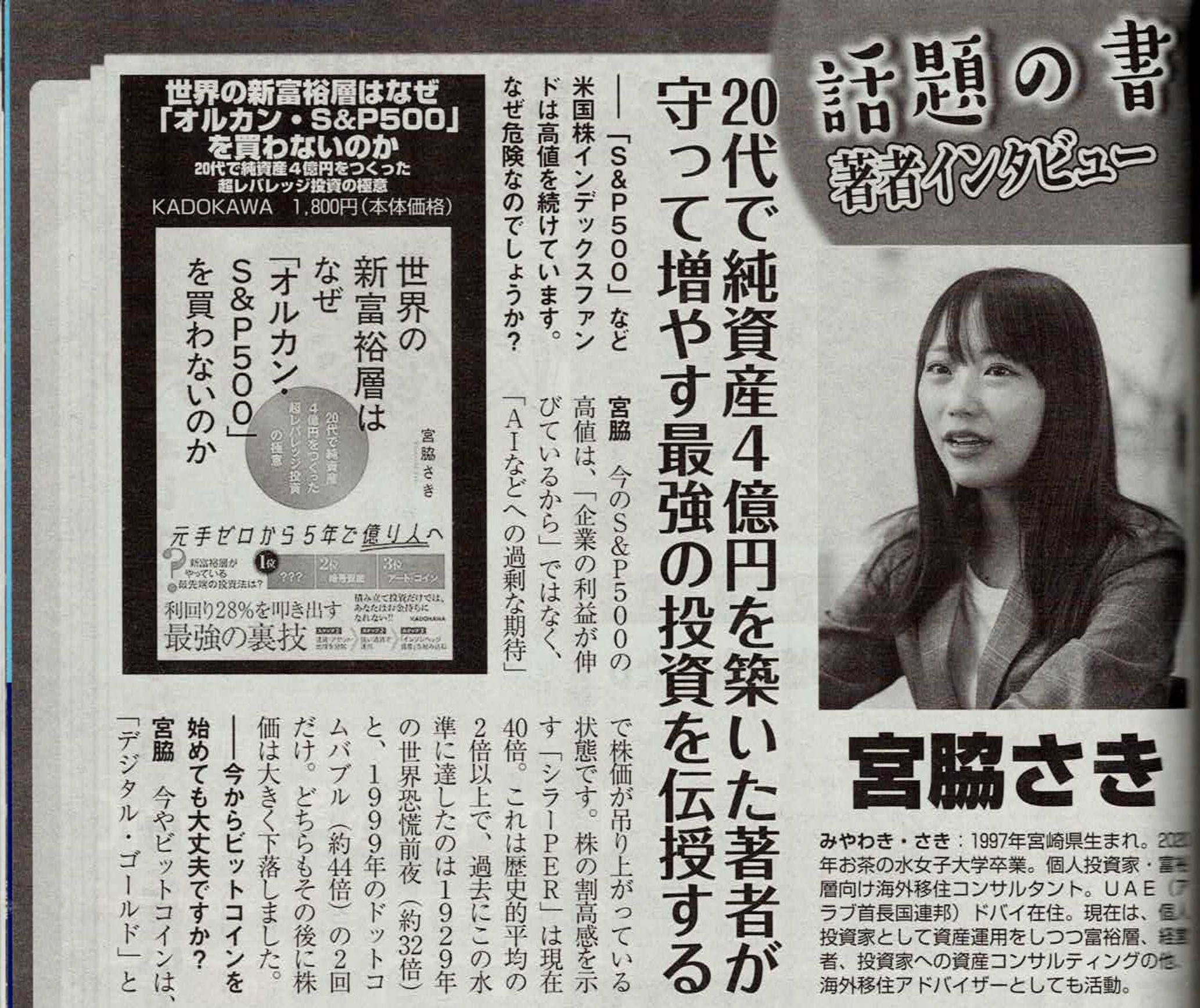 弊社代表・宮脇さきの著書『世界の新富裕層はなぜ「オルカン・S&P500」を買わないのか 20代で純資産4億円をつくった超レバレッジ投資の極意』が、雑誌『週刊実話』にて話題の書として掲載されました。