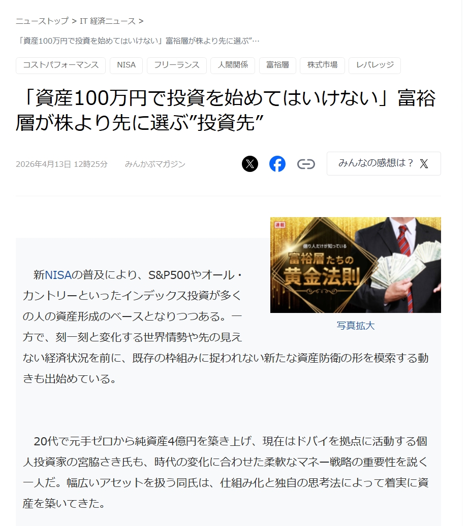 20代で元手ゼロから純資産4億円を築き上げた宮脇さきによる、富裕層が株式投資より先に取り組む「稼ぐ力への自己投資」をテーマにした記事です。
