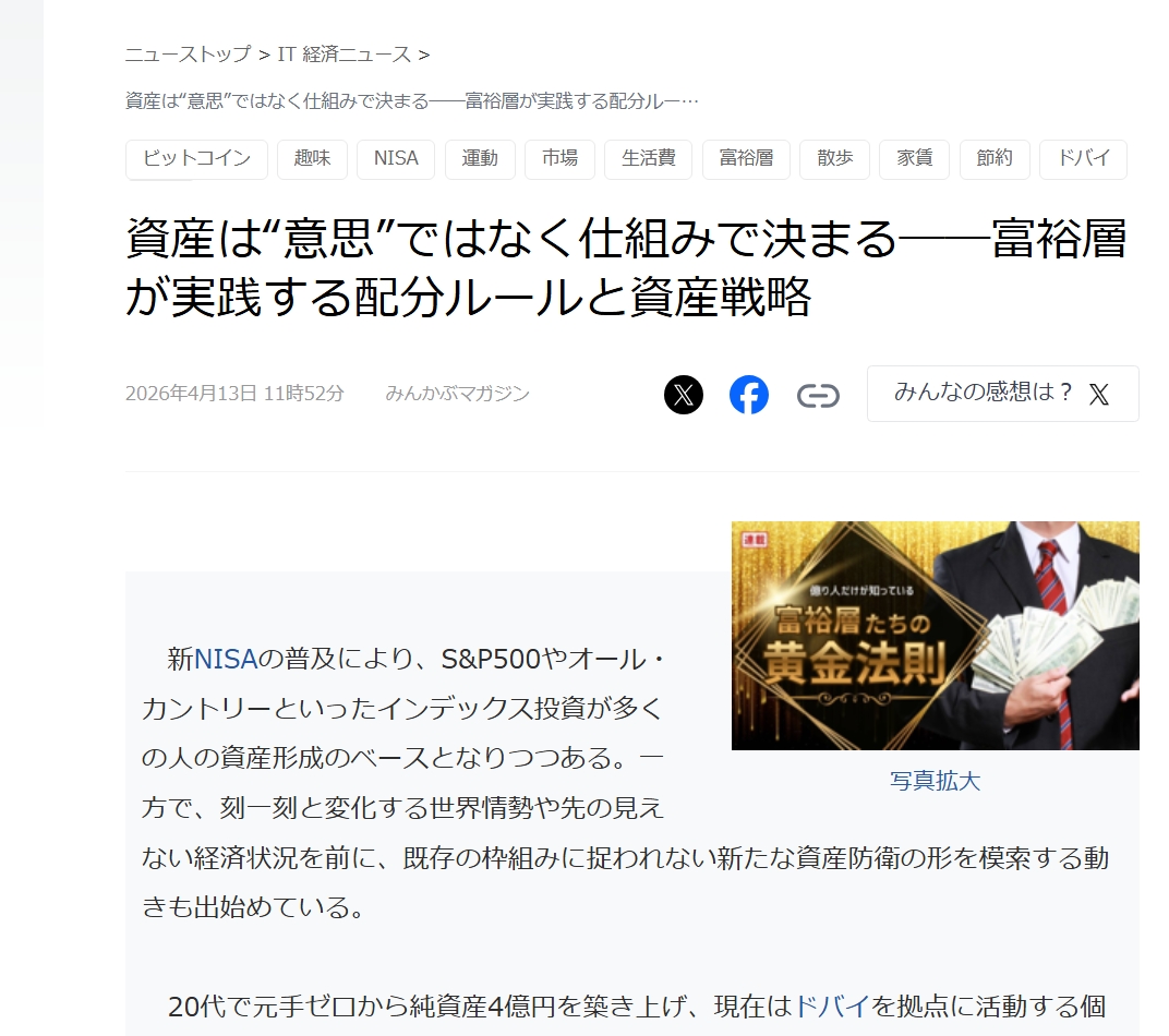 20代で元手ゼロから純資産4億円を築き上げた宮脇さきによる、富裕層が実践する資産配分と仕組みづくりをテーマにした記事です。
