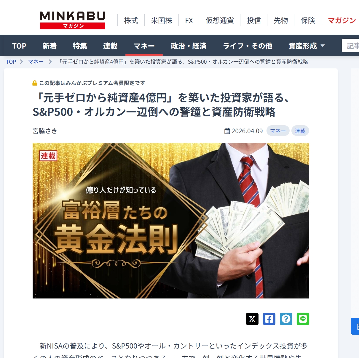 20代で元手ゼロから純資産4億円を築き上げた宮脇さきによる、S&P500・オルカン一辺倒への警鐘と、激動の時代における資産防衛戦略を解説した全4回の連載記事です。