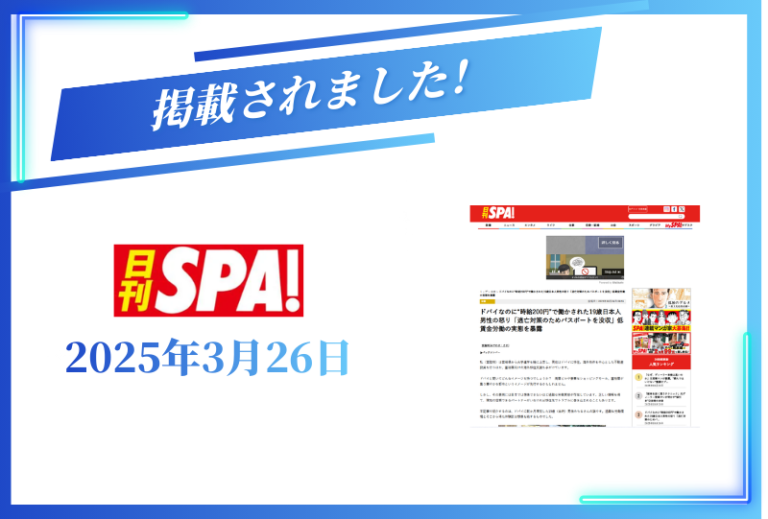 宮脇さきの記事が以下のタイトルで、日刊SPA!に掲載されました。 ドバイなのに“時給200円”で働かされた19歳日本人男性の怒り「逃亡対策のためパスポートを没収」低賃金労働の実態を暴露 &nb … 続きを読む 日刊SPA!に掲載されました【2025年3月26日】