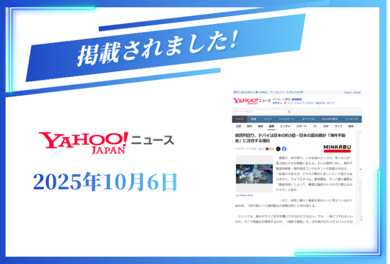 弊社代表・宮脇さきの記事が以下のタイトルで、Yahooニュースに掲載されました。 賃貸利回り、ドバイは日本の約3倍…日本の富裕層が「海外不動産」に注目する理由 現在 … 続きを読む Yahooニュースに掲載されました【2025年10月6日】